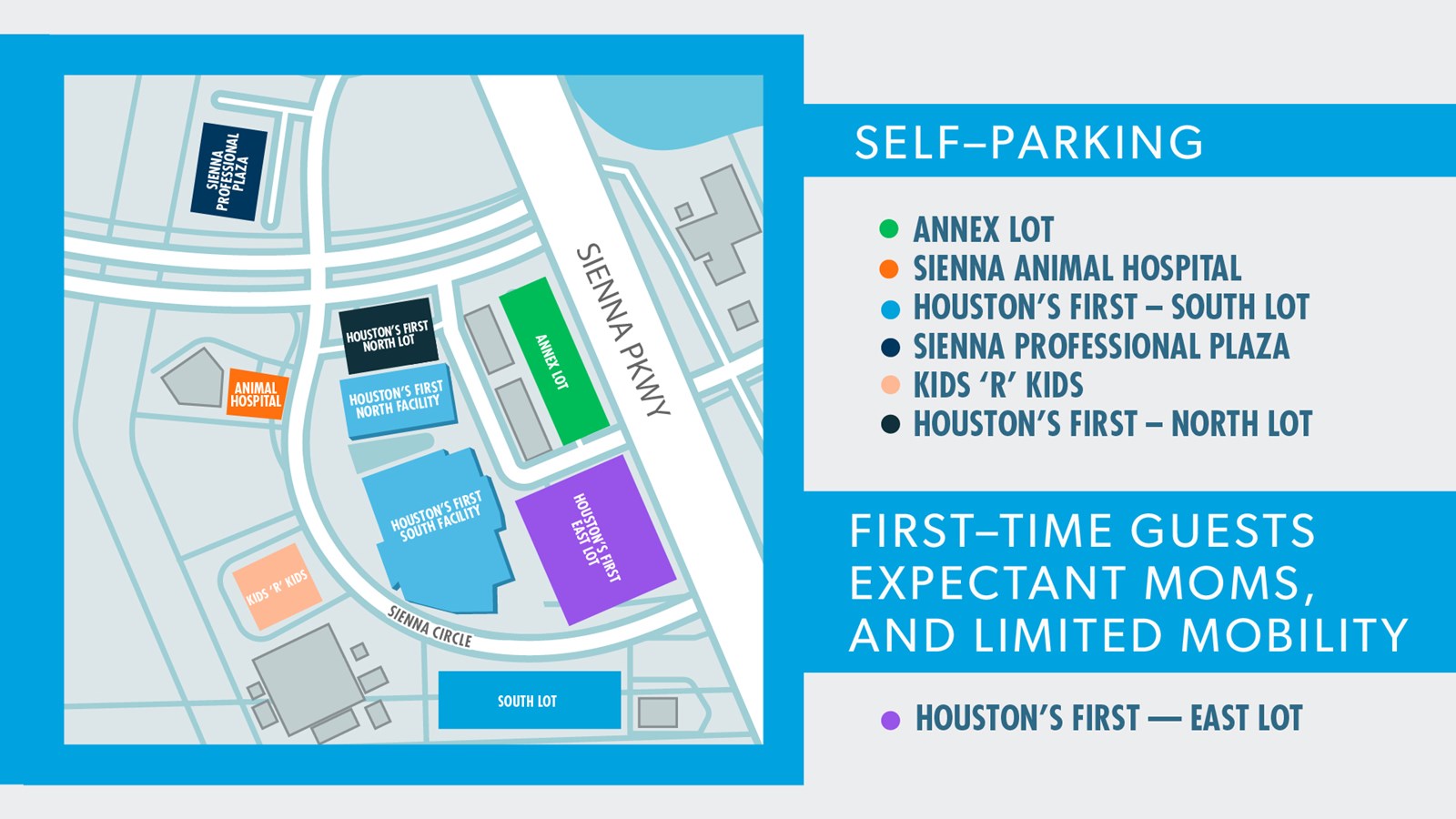 On Sunday mornings, members and regular attendees are asked to use the South Lot, Annex, Kids R Kids, and the Sienna Plantation Animal Hospital parking lot so first-time guests and those with limitations can park in front of the church.